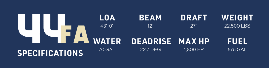 The Contender 44 FA (Fisharound) is a hardcore offshore performer built for anglers who want center console fishability with the protection, comfort, and overnight features of a sportfish. Designed on the proven twin-step hull of the flagship 44 ST, the 44 FA adds a fully enclosed cabin with berth, head, galley, and climate control — making it the ultimate long-range fishing and cruising hybrid.